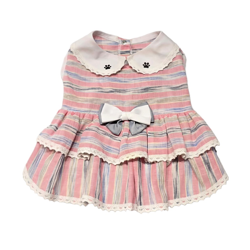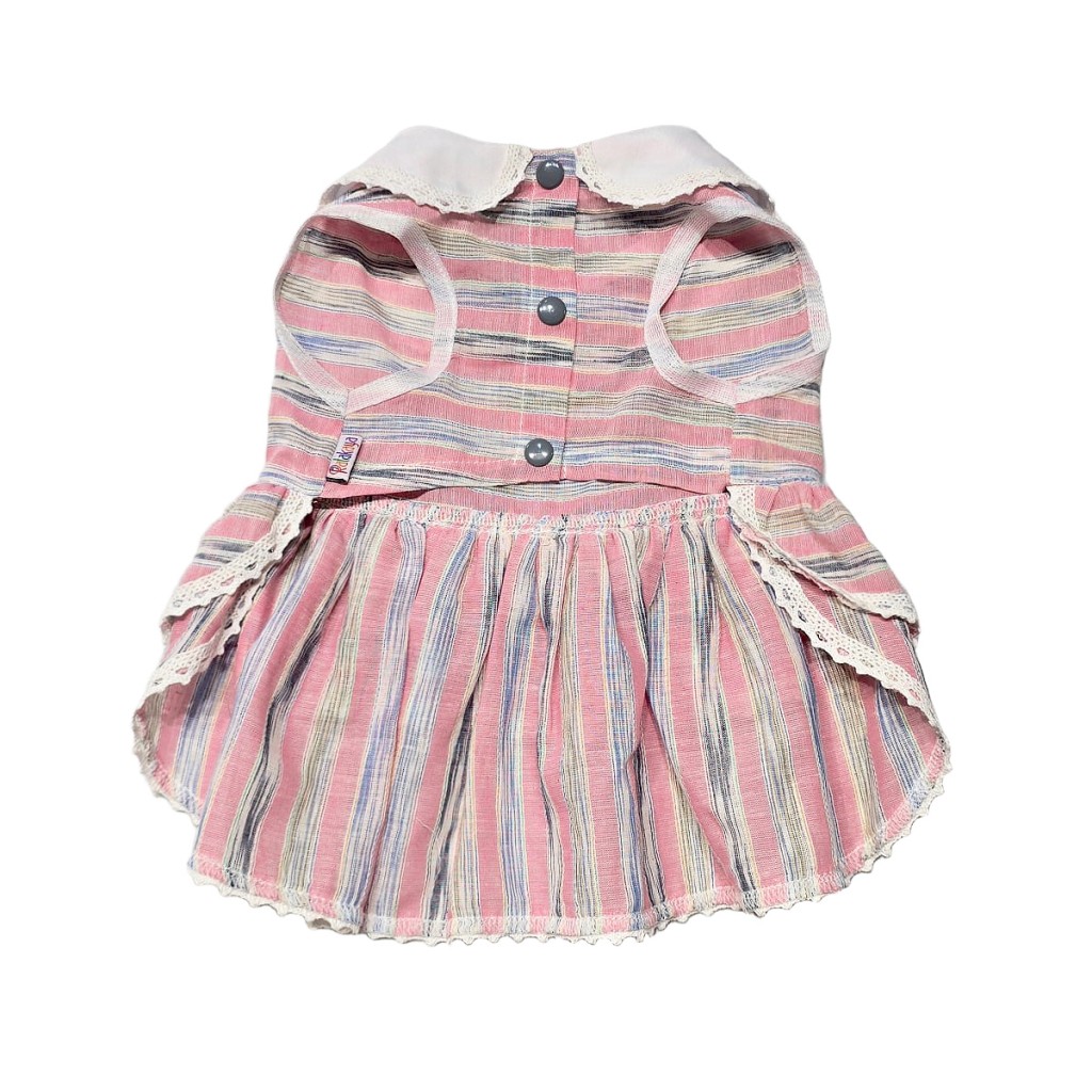 پیراهن نخی دخترانه مخصوص سگهای خانگی با طرح راهراه صورتی و آبی، یقه گلدوزیشده، پاپیون سفید و دامن چیندار با نوار گیپوری. مناسب فصلهای گرم، سبک، قابل شستوشو و بسیار بانمک.