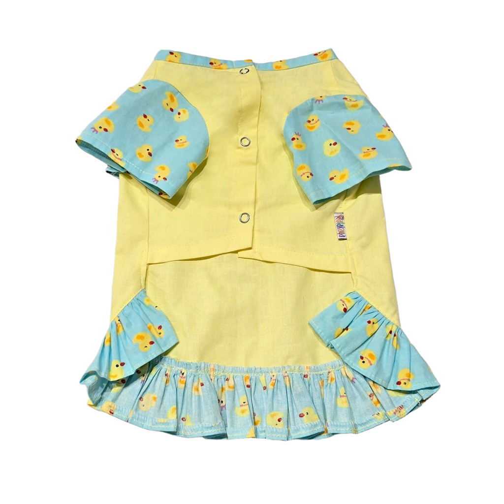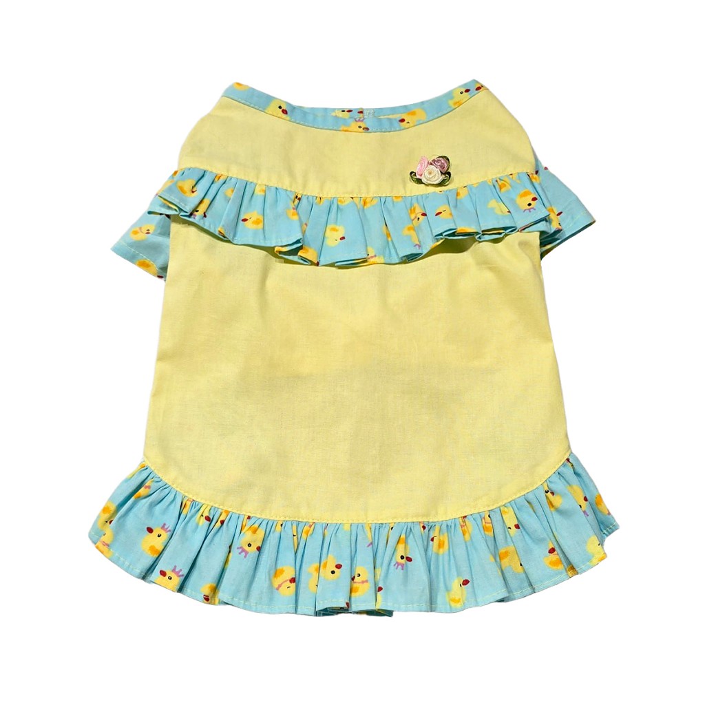پیراهن نخی دخترانه مخصوص سگهای خانگی با طراحی چیندار، رنگ زرد شاد، جزئیات گلدار آبی و بج کارتونی روی سینه. مناسب فصلهای گرم، سبک، قابل شستوشو و بسیار بانمک.