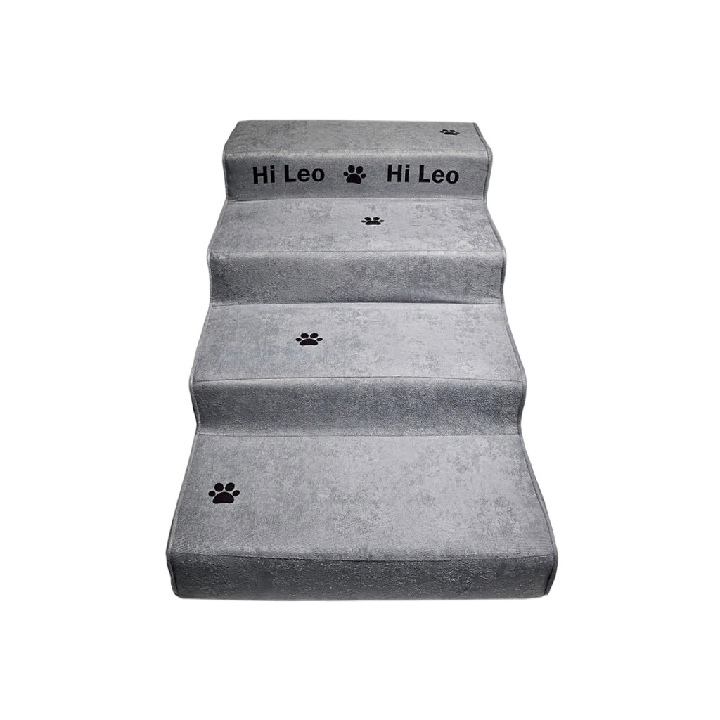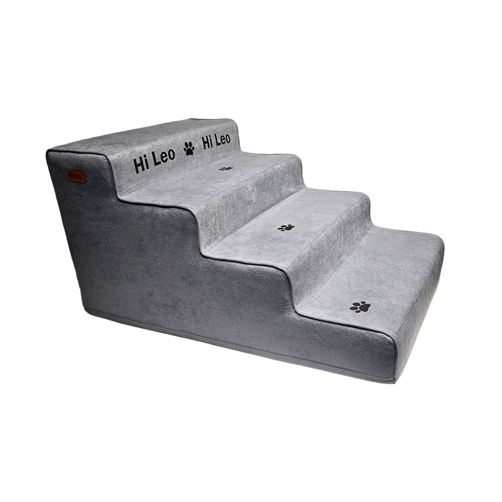 پله VIP سگ با طراحی سفارشی ۴ پلهای، رنگ طوسی، چاپ اسم پت، مناسب وزن بالای ۷ کیلوگرم. ساختهشده از متریال مقاوم و نرم، مناسب نژادهای کوچک و متوسط برای دسترسی راحت به مبل، تخت یا ماشین.