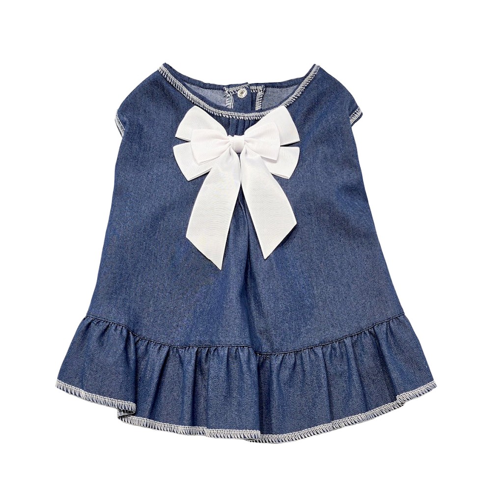 پیراهن جین دخترانه سگ با پاپیون سفید بزرگ، دامن چیندار و طراحی بدون آستین. مناسب سگهای ماده نژاد کوچک تا متوسط، سبک، راحت و قابل شستوشو.