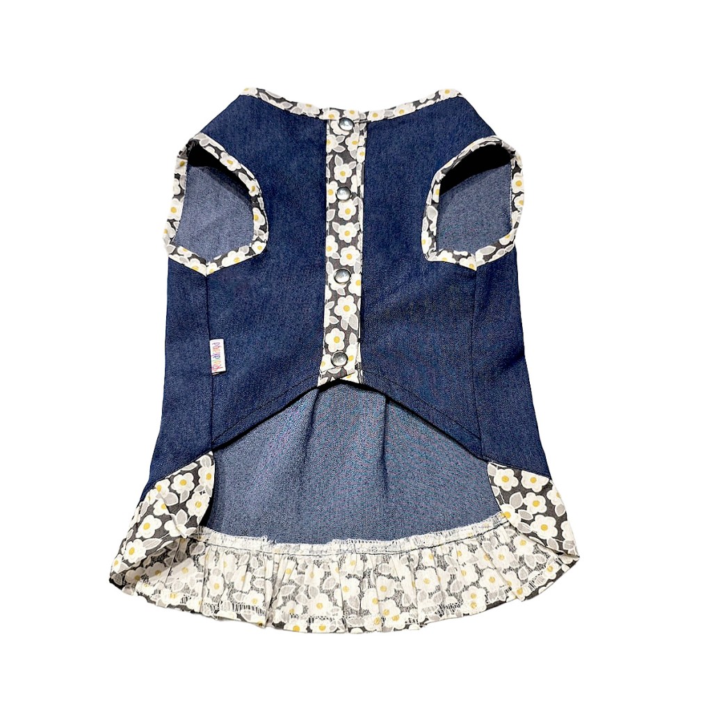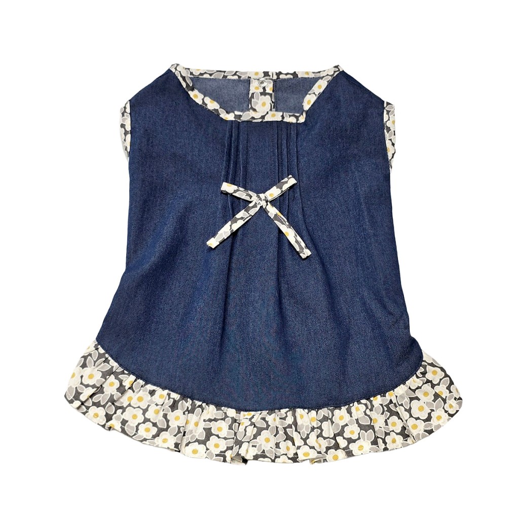 پیراهن جین دخترانه مخصوص سگهای خانگی با طراحی فانتزی، جزئیات گلدار صورتی، پاپیون تزئینی و دوخت تمیز. مناسب فصلهای معتدل، قابل شستوشو و بسیار بانمک برای سگهای نژاد کوچک تا متوسط.