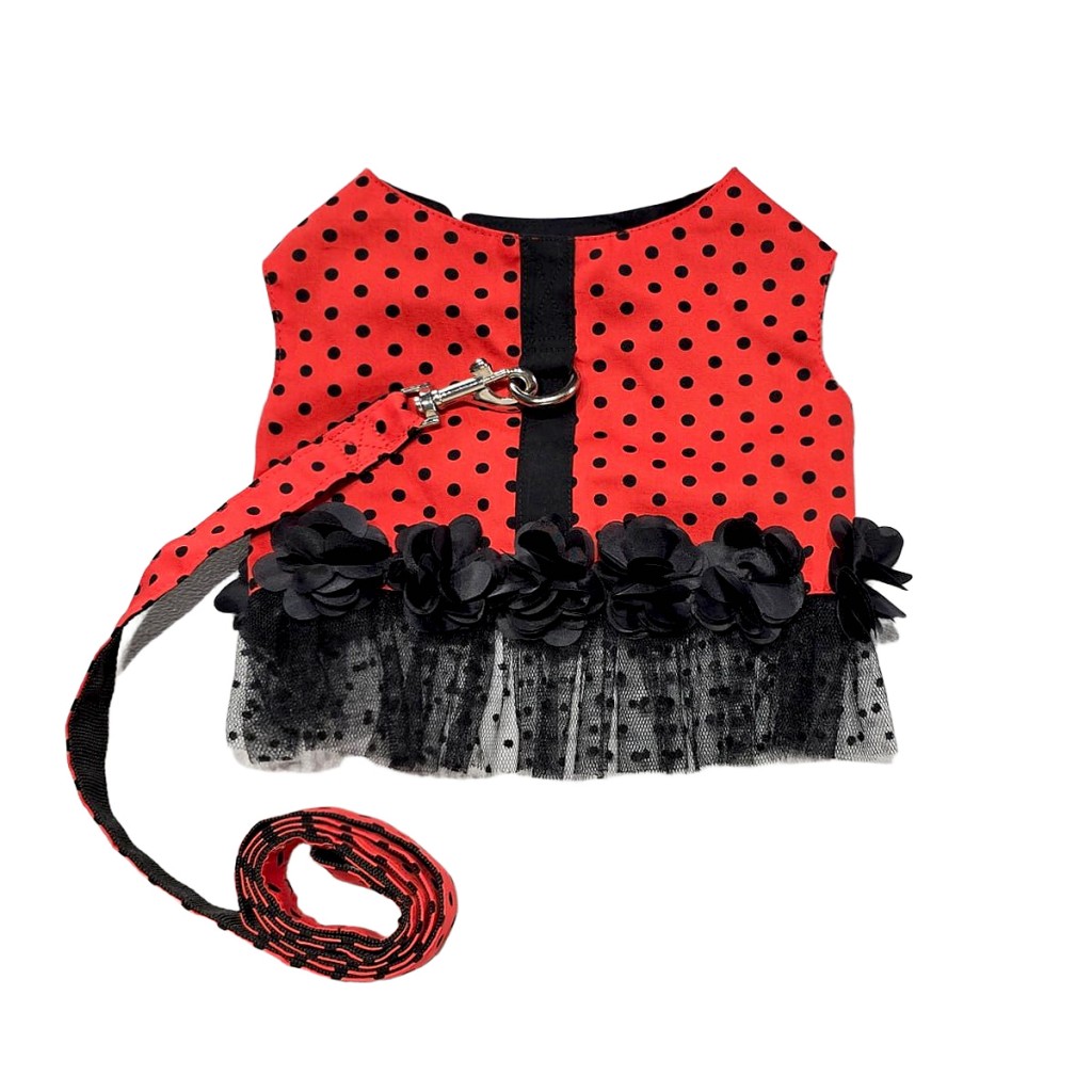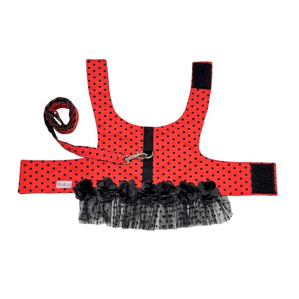لباس سگ دخترانه با طراحی خالخالی قرمز و مشکی، قلاده پوشیدنی، بند ست، گلدوزی و تور تزئینی. مناسب سگهای نژاد کوچک برای پیادهروی، جشن و عکاسی حرفهای.