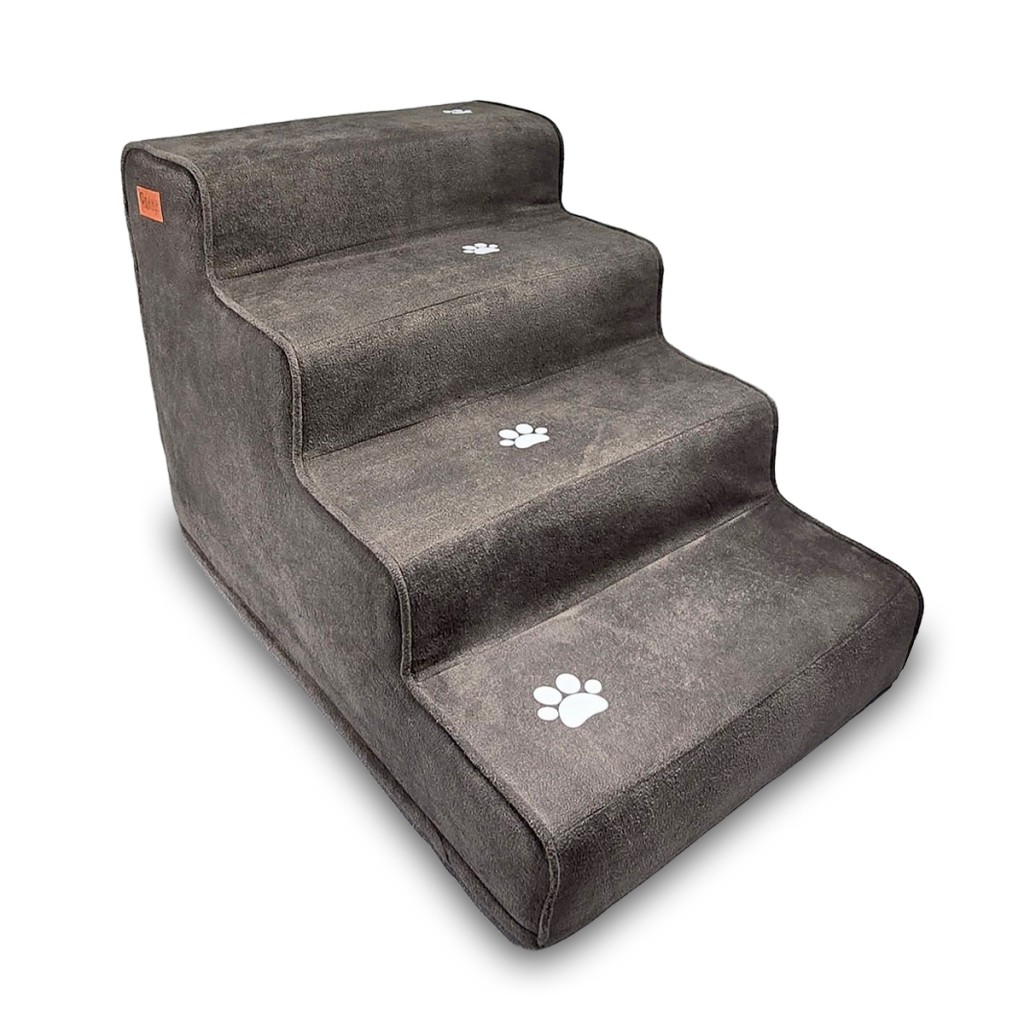 پله سگ ۴ پلهای با جنس مخمل یشمی و فوم پلیاتیلن، مناسب برای دسترسی راحت پتهای خانگی به تخت، مبل یا ماشین. طراحی سبک، مقاوم و ضد لغزش.