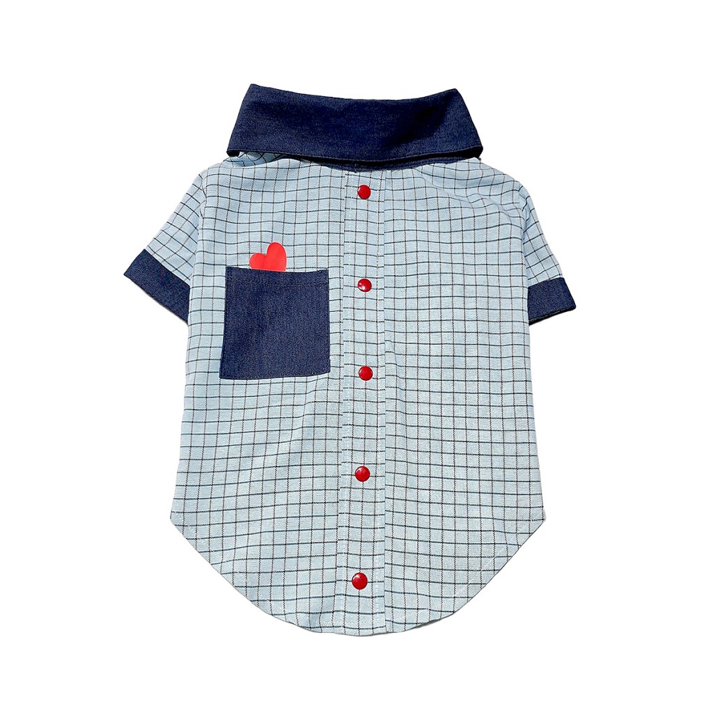 این پیراهن پسرانه مخصوص سگهای خانگی با طراحی چهارخونه آبی کمرنگ و جزئیات جذاب مثل یقه سرمهای و دکمههای قرمز، یه انتخاب عالی برای سگهای نر با استایل شاد و فانتزیه. جیب سرمهای در سمت چپ با قلب کوچیک قرمز، یه حس بازیگوشی و دوستداشتنی به لباس داده.
