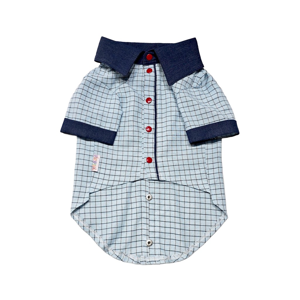 پیراهن پسرانه سگ با طرح چهارخونه آبی کمرنگ، یقه سرمهای، دکمههای قرمز و جیب فانتزی. مناسب استفاده روزمره، سبک، قابل شستوشو و مناسب نژادهای کوچک تا متوسط.
