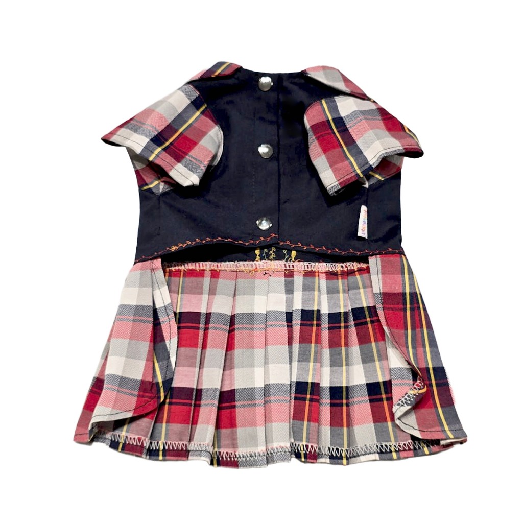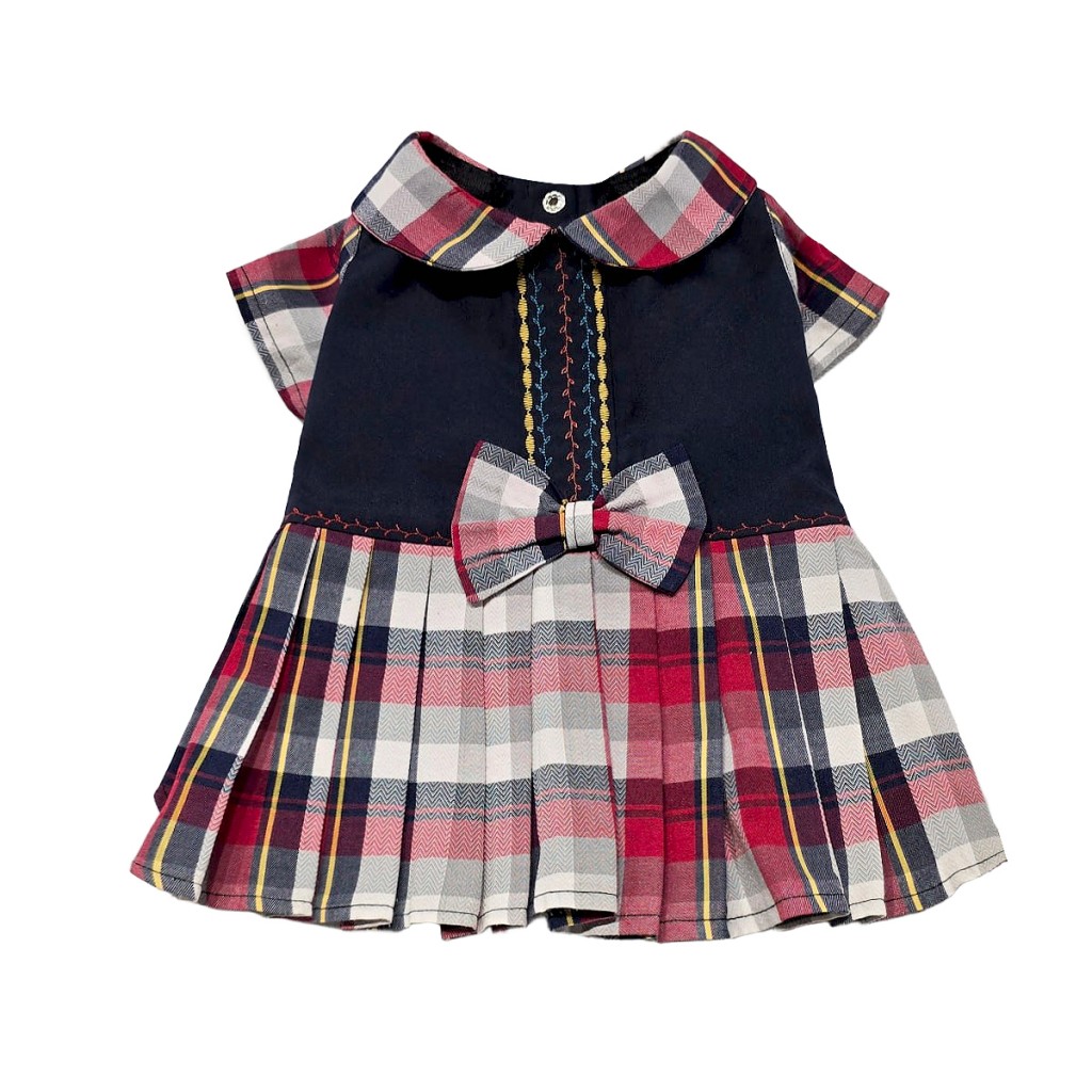 لباس سگ دخترانه با بالاتنه سرمهای، یقه پترپن چهارخونه، دامن شطرنجی قرمز و سفید، پاپیون کمری و نوار تزئینی زرد. مناسب سگهای نژاد کوچک برای مناسبتهای خاص و استایل نیمهرسمی.