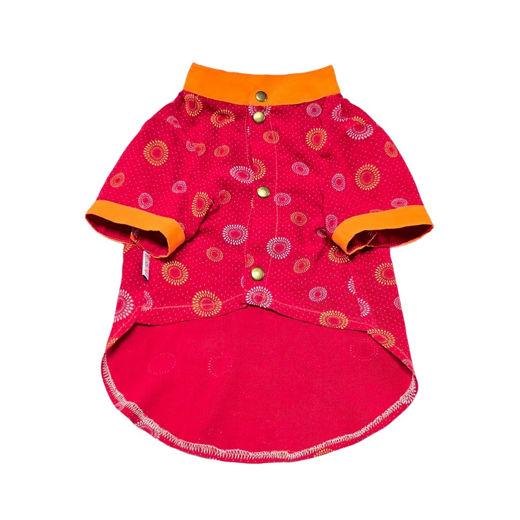 پیراهن پسرانه سگ با رنگ قرمز، طرح دایرهای زرد و صورتی، یقه و سرآستین نارنجی، دکمهدار و مناسب نژادهای کوچک. طراحی شاد، راحت و قابل شستوشو.